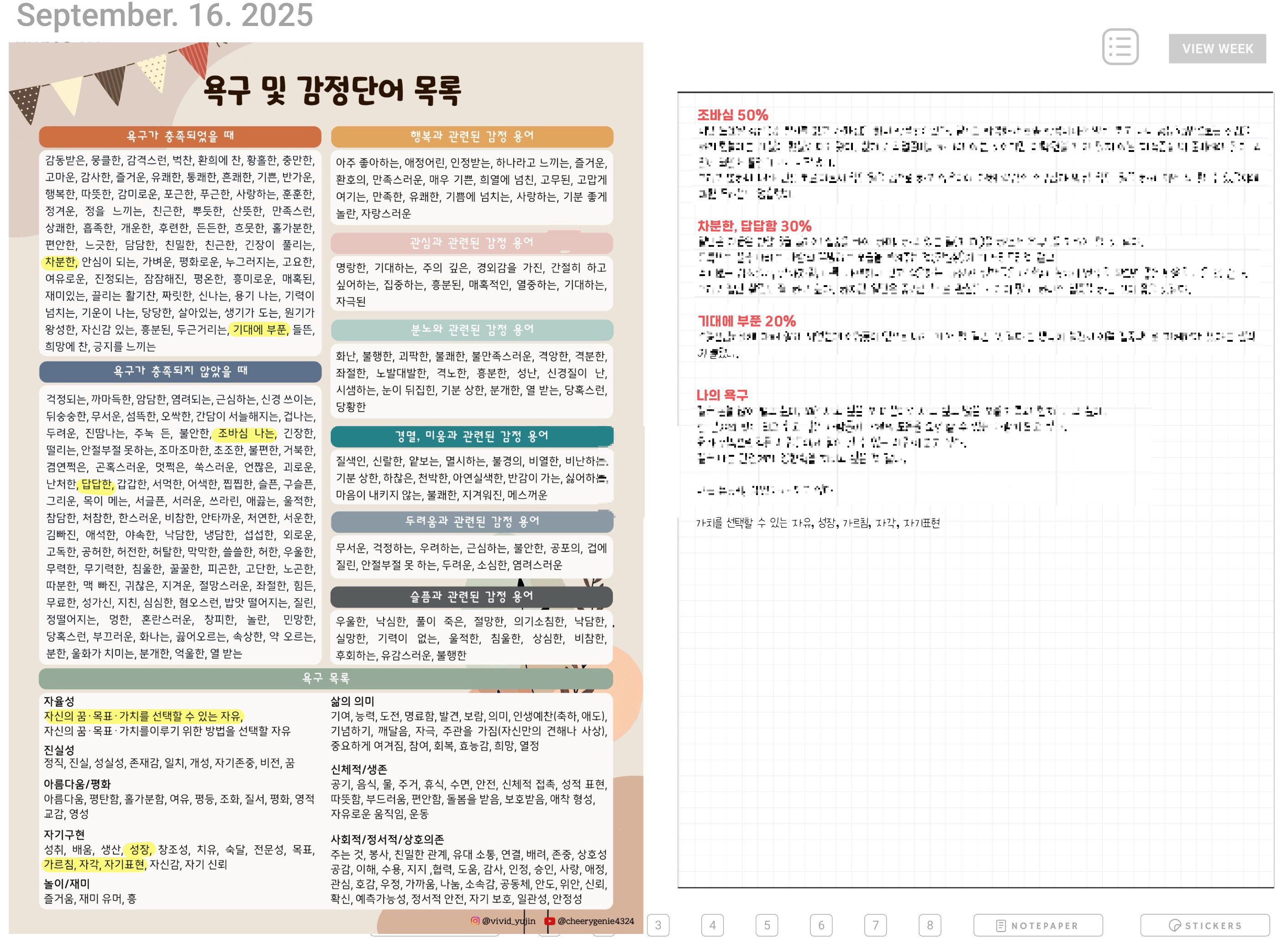 나는 아이패드 굿노트에다가 왼편에는 욕구&감정단어 목록을 보면서 오늘 내가 느낀 감정들에 및줄을 긋고 그 감정이 어떻게 해서 느끼게 됐는지 간단하게 적는다.